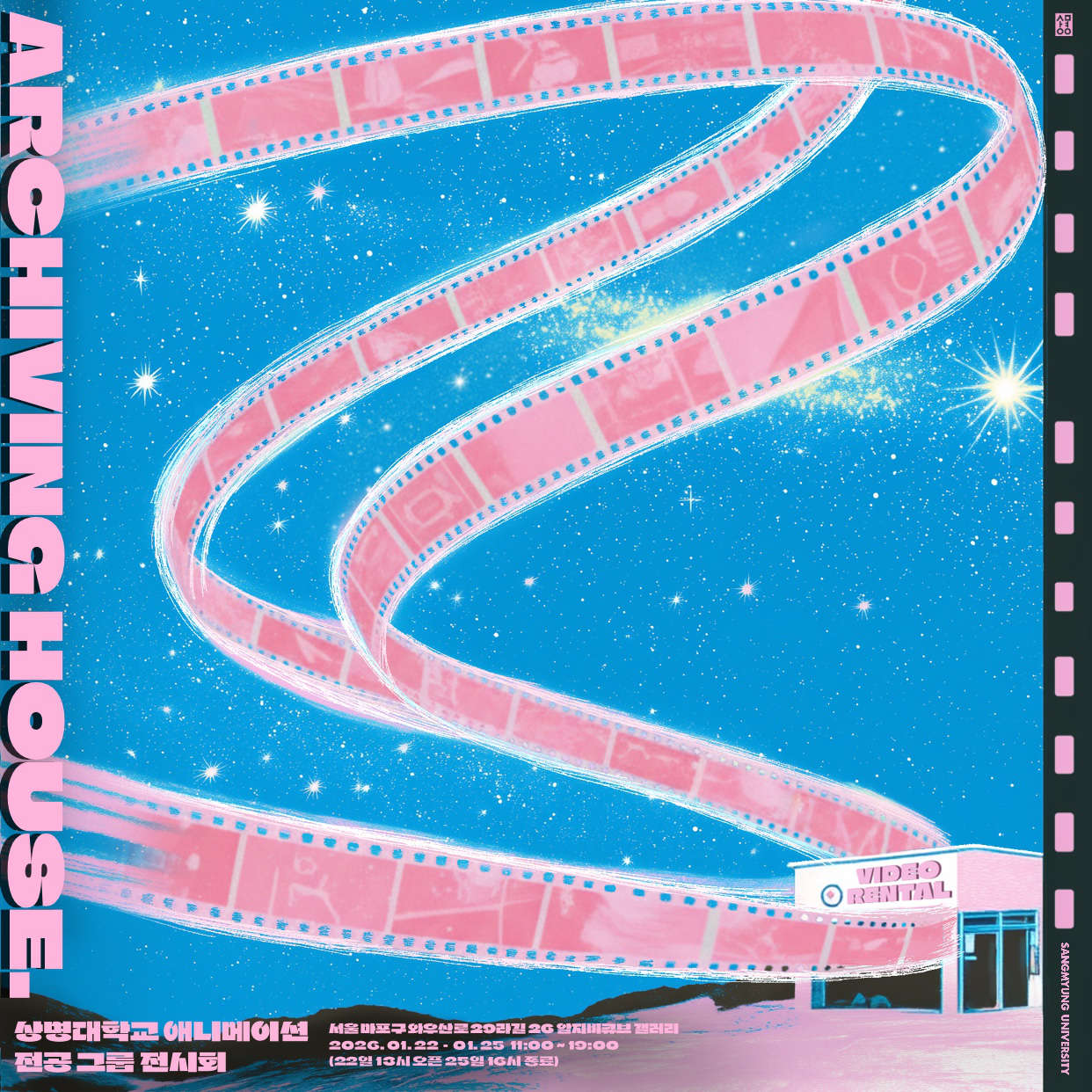 상명대학교 애니메이션전공 21학번 7인이 기록한 2025년의 단편들. 당신의 기억 속, 가장 빛나던 장면을 찾아줄 ‘Archiving House’가 문을 엽니다. 2026.1.22.(목)~2026.1.25.(일) 갤러리 알지비큐브.