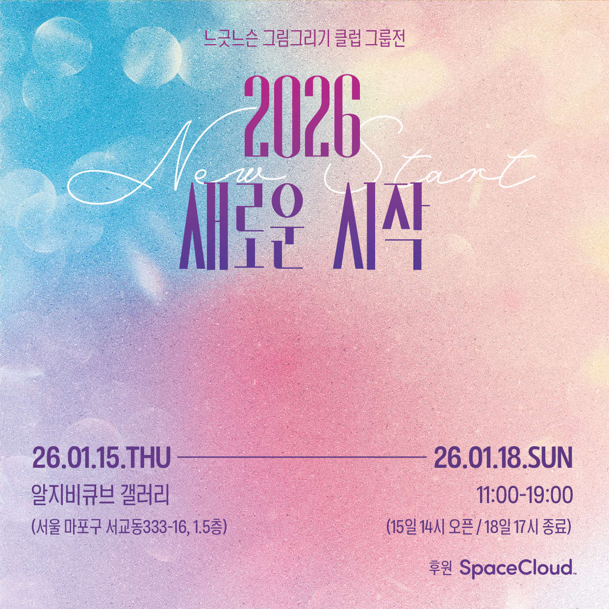 느긋느슨 그림그리기 클럽의 여섯 명의 작가가 2026년 새로운 시작을 주제로 일러스트·만화·페인팅 작품을 통해 붉은 말의 해가 지닌 에너지와 각자의 새로운 시선을 담아냅니다. 2026.1.15.(목)~2026.1.18.(일) 갤러리 알지비큐브.