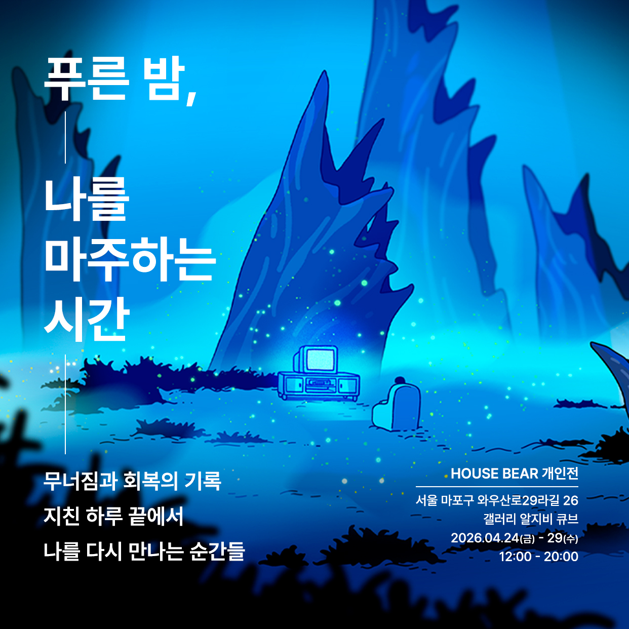점점 희망보다 절망과 체념이 익숙해져 가는 시대 속에서, 이 전시가 잠시 멈춰 서서 서로의 온기를 느낄 수 있는 작은 계기가 되기를 바랍니다. 이곳에서의 기억이 여러분에게 하나의 따뜻한 순간으로 남기를 바라며. 이야기를 전합니다. 온화한 마음으로, 사랑으로! 2026.3.12.(목)~2026.3.15.(일) 갤러리 알지비큐브.