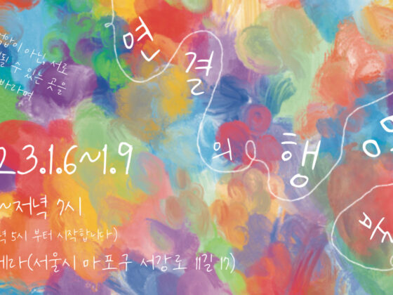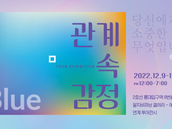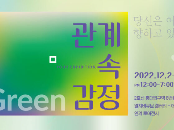 View Post 2061 min 전시종료 알지비큐브 전시소식 에그템페라 전시소식 전시소식 관계속감정 GREEN Posted on 2022-11-262022-12-23byurbanpluto-admin 다양한 관계에서 느껴지는 미묘한 감정들. 관계에 대해 생각해 볼 수 있는 공감 전시 ‘관계 속 감정’이 3년 만에 다시 열립니다. 2022.12.2(금)~2022.12.7(수)까지 홍대 인근을 투어 하며 즐기는 미션형 전시.