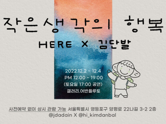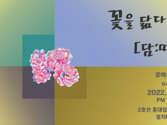 View Post 2830 min 전시종료 알지비큐브 전시소식 전시소식 꽃을 닮다 [담:따] Posted on 2022-12-242022-12-26byurbanpluto-admin 누구나 자신만의 꽃봉오리를 지니고 있으나 아직 피어내지 못해 지치고 방황하는 이들에게… 2022.12.29(목)~2022.12.31(토)까지 홍대입구역 인근 갤러리 알지비큐브에서 관람.