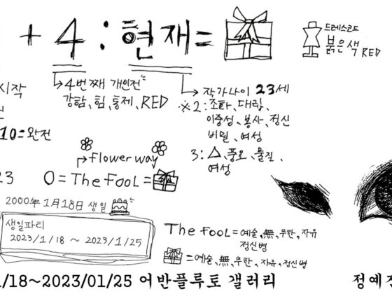 View Post 3241 min 전시종료 어반플루토 전시소식 전시소식 19+4:현재=선물 Posted on 2023-01-122023-01-12byurbanpluto-admin ’19+4:현재=선물’ 전시는 작가의 삶을 통해 관객이 타인의 시점에서 ‘사는 방법’에 관해 고민하는 시간을 제공한다. 2023.1.18(수)~2023.1.25(수)까지 9호선 선유도역 인근 어반플루토 갤러리에서 관람.