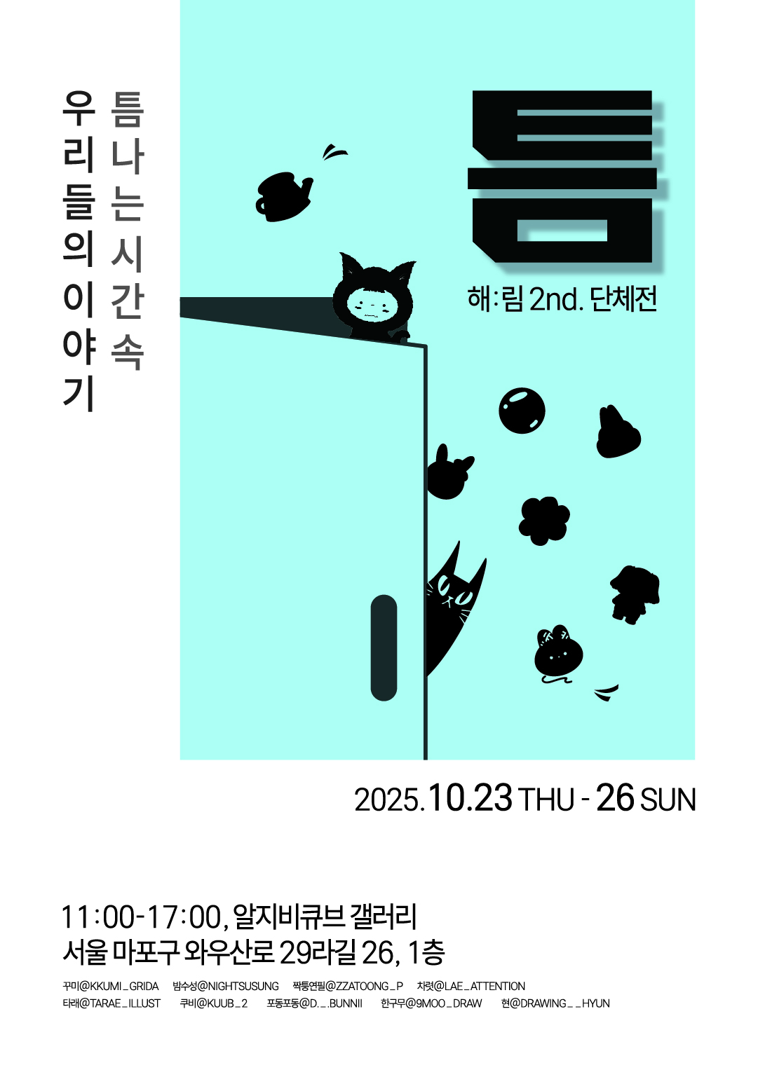 이번 전시에서 해:림(뭐해? 그림 그리자의 줄임말)의 작가들은 각자가 해석한 일상에서의 틈을 작품을 통해 공유하고자 한다.