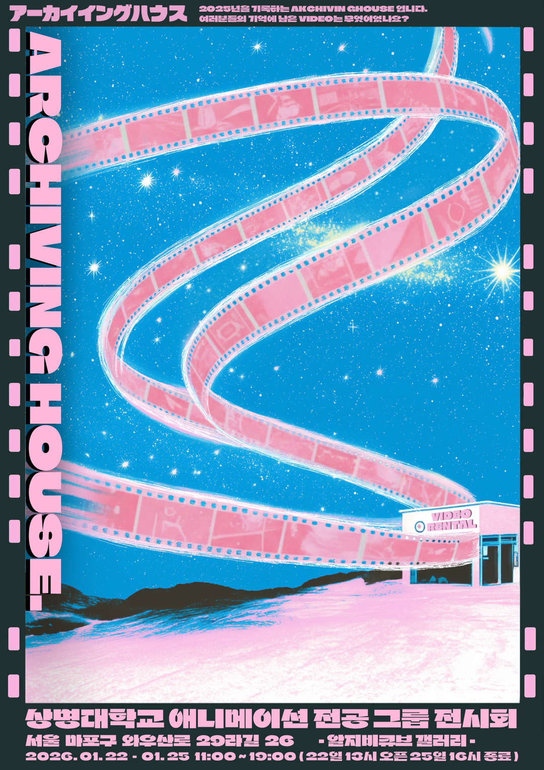 누구에게나 되감아보고 싶은 시절, 간직하고 싶은 장면이 있습니다. ‘Archiving House’는 상명대학교 애니메이션전공 21학번 7인(박예진, 유민아, 장규연, 주영주, 진효정, 최영은, 한유진)이 치열하게 달려온 2025년의 시간을 ‘비디오테이프’에 꾹꾹 눌러 담은 기록 보관소입니다.