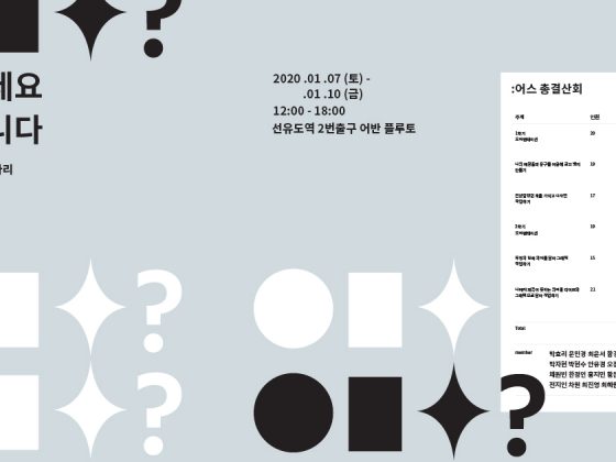 어스오세요 환영합니다 : 어스 총결산회 전시는 동아리 US 부원들이 1년 동안 ‘나’, ‘책’, ‘빛’, ‘왜곡’에 대한 주제를 가지고 자신만의 시각 언어로 풀어낸 전시회. 2020.1.7(화) ~ 2020.1.10(금)까지 9호선 선유도역 인근 어반플루토 갤러리에서 관람.