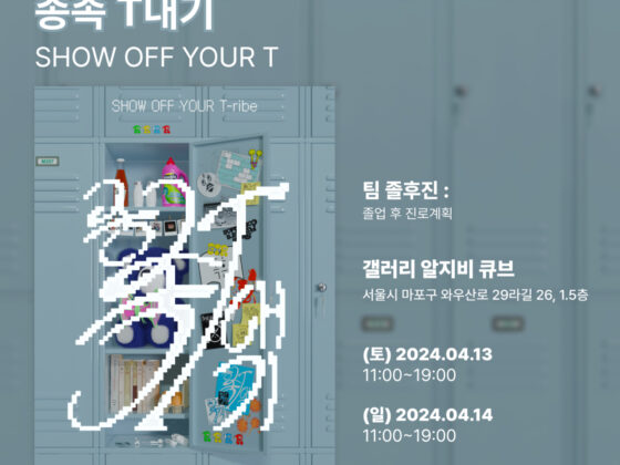 View Post 2981 min 전시종료 알지비큐브 전시소식 전시소식 종족 T내기 Posted on 2024-04-022024-04-03byurbanpluto-admin 혼자만 좋아한다고 생각하지만 어딘가에는 나와 같은 사람이 있을 수 있다. 나와 비슷한 취향을 가진 가상 단체를 만들어 전시하는 졸후진의 첫번째 프로젝트 ‘종족 T내기’ 2024.4.13(토)~2024.4.15(월) 갤러리 알지비큐브.